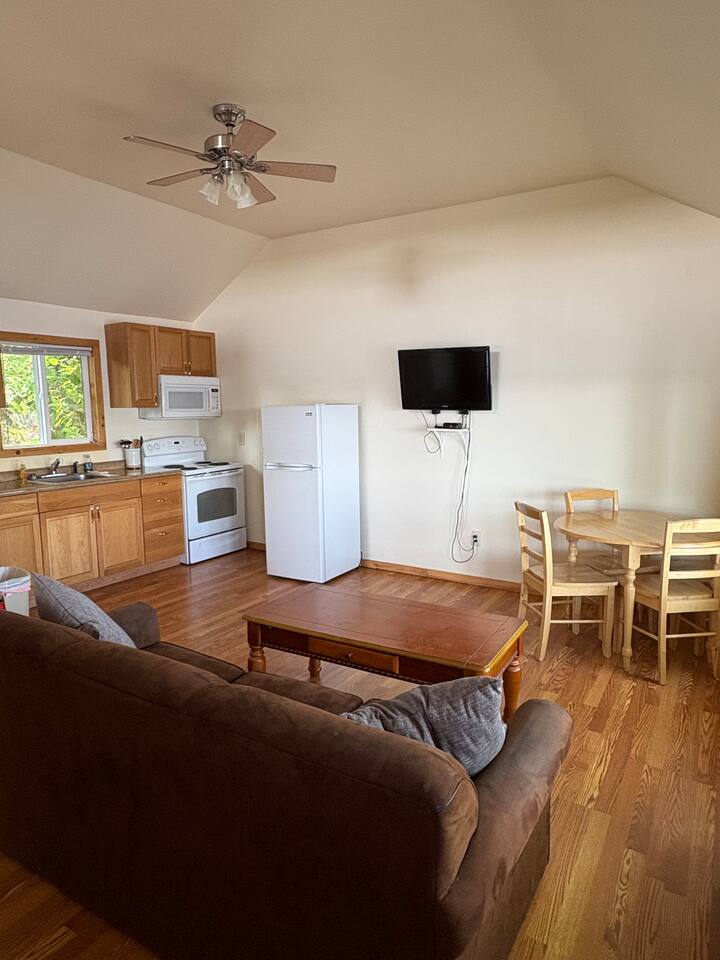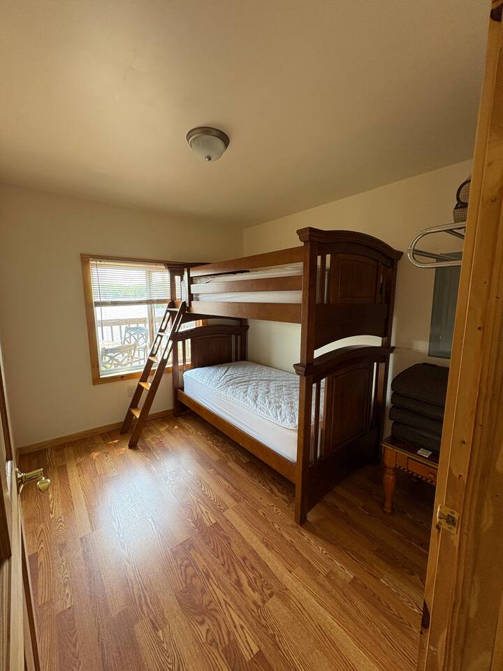 Cliffside Hideaway is a cozy, seasonal lakeside retreat on Black Lake, designed for guests seeking a private and relaxed getaway. Perched above the water, this two-bedroom, one-bath cabin comfortably accommodates up to seven guests and offers a private dock down below. Guests reach the cabin by walking up a set of stairs to a private entrance, where a deck welcomes you with seating for four and a beautiful lake view. Inside, the cabin opens into a comfortable living area that includes a renovated kitchen, dining area with seating for four, and a cozy living area. The sofa coverts to a full-size bed, providing additional sleeping space. The cabin includes two bedrooms, designed with families in mind. One bedroom features a queen bed and stunning lake views. While the second bedroom includes a twin-over-full bunk bed with a twin trundle, making it ideal for children or additional guests. A newly updated bathroom is located nearby and features a walk-in stand-up shower. Guests can enjoy relaxing on the deck or head down the stairs to their private dock for fishing or spending time by the water. Please note that access to both the cabin and the dock requires the use of stairs. Located within Back Bay Campground, Cliffside Hideaway offers a private setting with full access to campground amenities, including a heated pool, 24/7 arcade, walking trails, and a camp store offering seasonal rentals and activities. Whether you’re spending the day out on the lake, exploring the campground, or unwinding back at the cabin, everything you need for a relaxed lake stay is close at hand. Cliffside Hideaway is currently undergoing off-season renovations and will be ready for the upcoming season. Planned updates include a renovated kitchen, bathroom, deck, and all-new furnishings. Photos may not reflect the latest improvements, but updated photos will be added once renovations are complete. All descriptions represent the updated features.