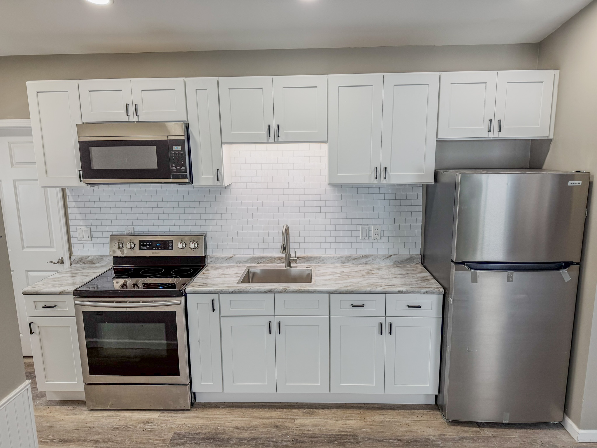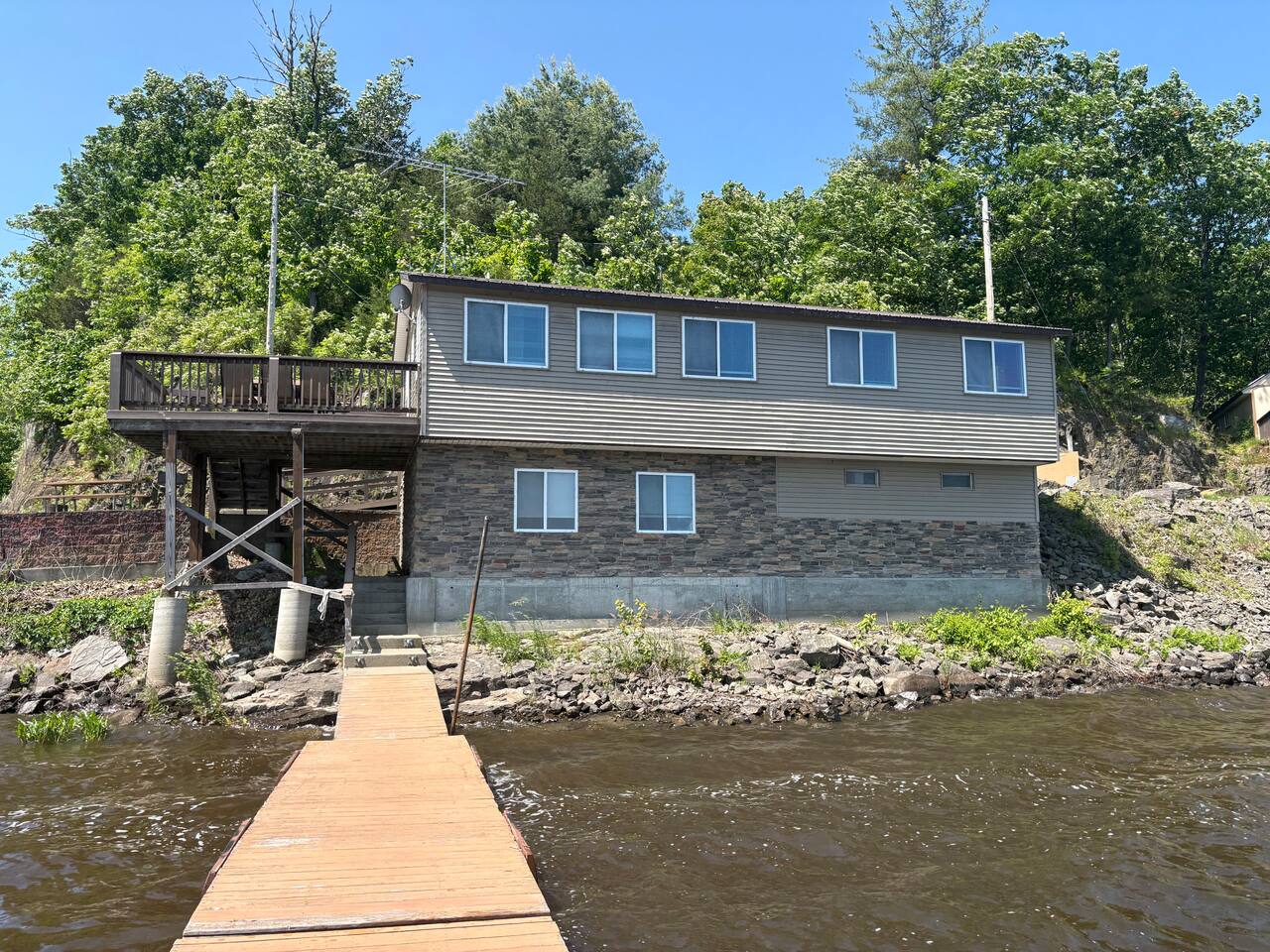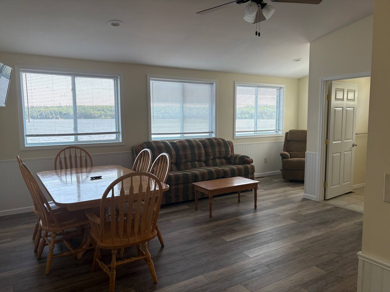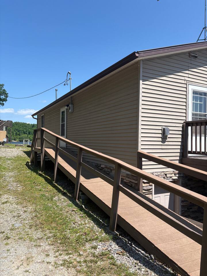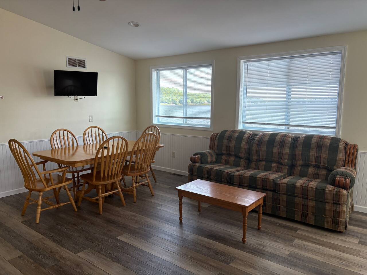 Lakeside Lodge is a beautifully updated, seasonal lakefront cabin offering generous space for gathering while painting its cozy charm. This three-bedroom, 1.5-bath cabin comfortably sleeps up to twelve guests and provides flexible sleeping arrangements for larger families or groups. The cabin offers multiple entry points, including a handicap-accessible ramp leading into the main living area. This space features a newly upgraded kitchen with brand-new appliances, a dining table with seating for eight, a full-size sofa bed, and a smart TV. A half bath is located nearby, along with stairs leading to the finished basement. The main floor also includes three bedrooms. Two bedrooms each feature a queen bed, while the third bedroom includes a twin bunk bed. A full bathroom is conveniently located nearby and features a walk-in shower with seating and handicap-accessible grab bars. Downstairs, the finished basement opens into a large, flexible space designed for relaxation and additional sleeping. Two sectional sofas convert into full-size beds, and an additional smart TV provides an ideal set up for movie nights. From the basement, guests can step outside to access the private dock, or head upstairs to the private deck with seating for six overlooking the water. Please note the basement and dock require stairs for access. Located within Back Bay Campground, Lakeside Lodge offers a private setting with full access to campground amenities, including a heated pool, 24/7 arcade, walking trails, and a camp store offering seasonal rentals and activities. Whether you’re spending the day out on the water, exploring the campground, or unwinding back at the cabin, everything you need for a relaxed lake stay is close at hand. Lakeside Lodge is currently undergoing off-season renovations and will be ready for the upcoming season. Planned updates include a renovated kitchen, bathrooms, living room, deck, and all-new furnishings. Photos may not reflect the latest improvements, but updated photos will be added once renovations are complete. All descriptions represent the updated features.