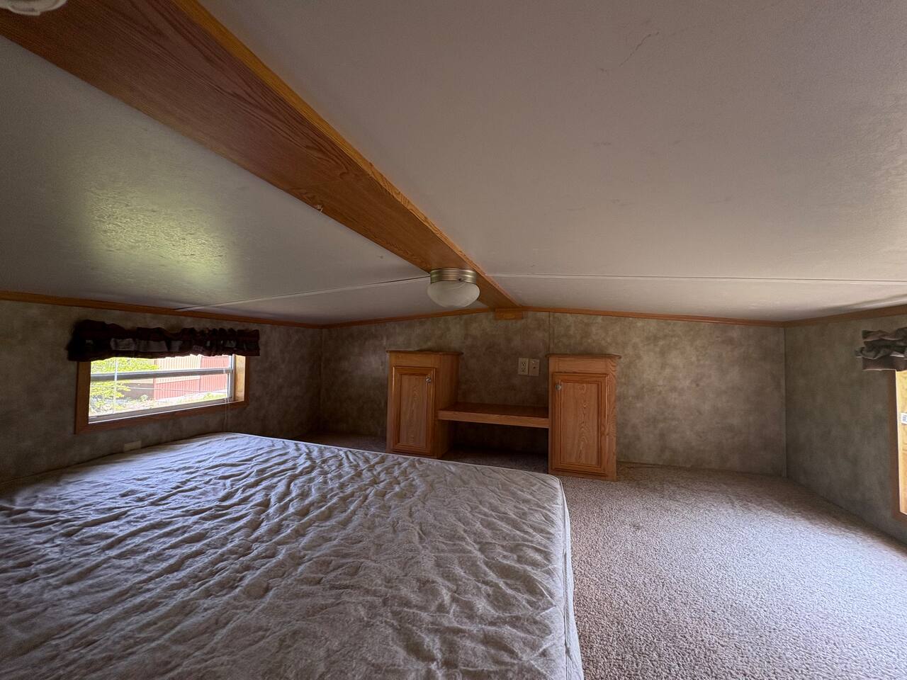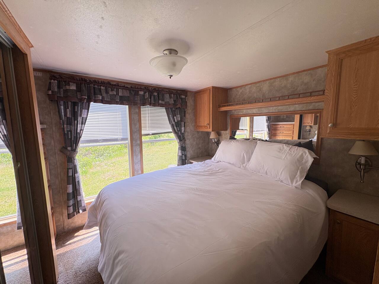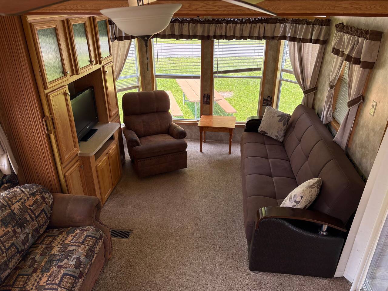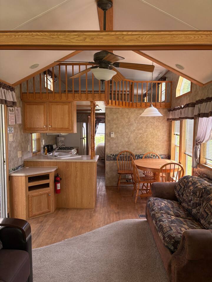 The Vintage Voyager is a seasonal RV located within Back Bay Campground, offering a simple and affordable stay on Black Lake. This one-bedroom, one-bath RV comfortably sleeps up to five guests and is a great option for budget-conscious travelers. The RV features two entry points. One entrance leads up a short set of stairs to a covered porch with seating for four. From here, guests enter through glass doors into the main living area, which includes two couches, a recliner, a TV, and a four-person dining table. The compact kitchen is equipped with basic essentials and the full bathroom is located nearby. The bedroom features a queen bed, dresser, and closet for storage. Near the bedroom door, a small set of stairs leads to the loft area. While the loft does not have standing room, it provides additional sleeping space and overlooks the living area below. The RV is equipped with air conditioning units in both the living area and bedroom to help keep guests comfortable during warmer months. Located within Back Bay Campground, the Vintage Voyager offers a private setting with full access to campground amenities including a heated pool, 24/7 arcade, walking trails, and a camp store offering seasonal rentals and activities. Guests can take a short walk down the road to the dock, a convenient spot for fishing. With its classic campground feel and simply comforts, Vintage Voyager is an affordable option for guests who value location.