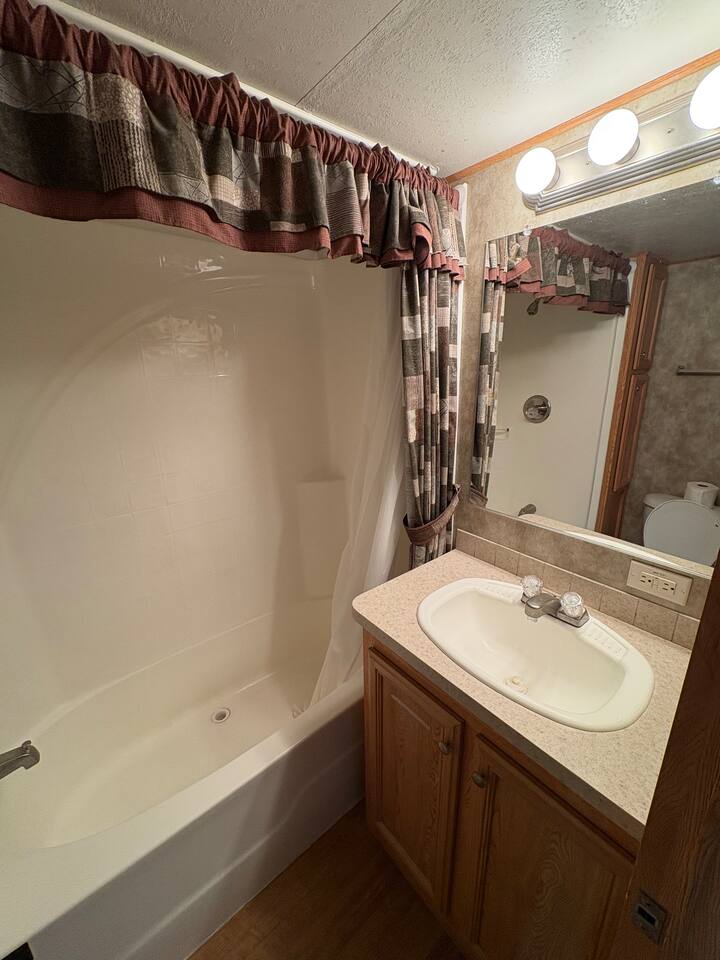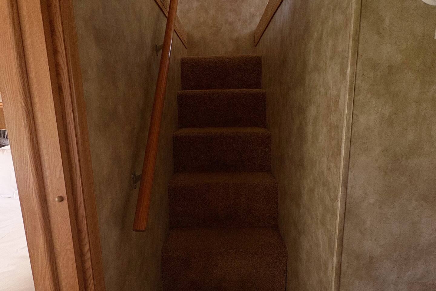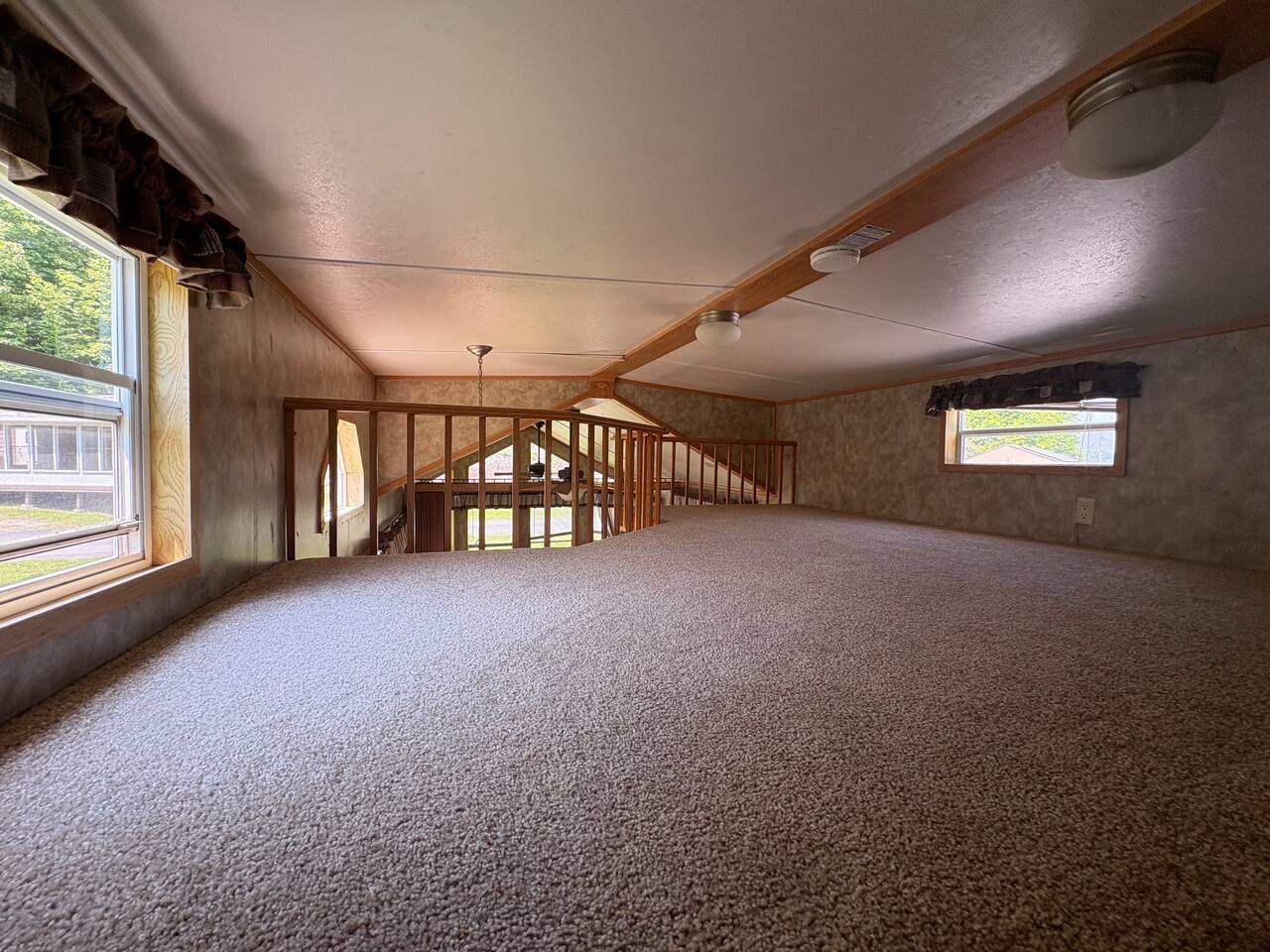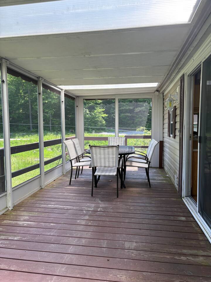 The Vintage Voyager is a seasonal RV located within Back Bay Campground, offering a simple and affordable stay on Black Lake. This one-bedroom, one-bath RV comfortably sleeps up to five guests and is a great option for budget-conscious travelers. The RV features two entry points. One entrance leads up a short set of stairs to a covered porch with seating for four. From here, guests enter through glass doors into the main living area, which includes two couches, a recliner, a TV, and a four-person dining table. The compact kitchen is equipped with basic essentials and the full bathroom is located nearby. The bedroom features a queen bed, dresser, and closet for storage. Near the bedroom door, a small set of stairs leads to the loft area. While the loft does not have standing room, it provides additional sleeping space and overlooks the living area below. The RV is equipped with air conditioning units in both the living area and bedroom to help keep guests comfortable during warmer months. Located within Back Bay Campground, the Vintage Voyager offers a private setting with full access to campground amenities including a heated pool, 24/7 arcade, walking trails, and a camp store offering seasonal rentals and activities. Guests can take a short walk down the road to the dock, a convenient spot for fishing. With its classic campground feel and simply comforts, Vintage Voyager is an affordable option for guests who value location.