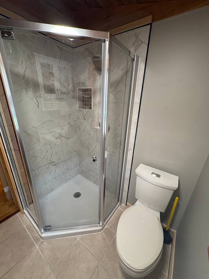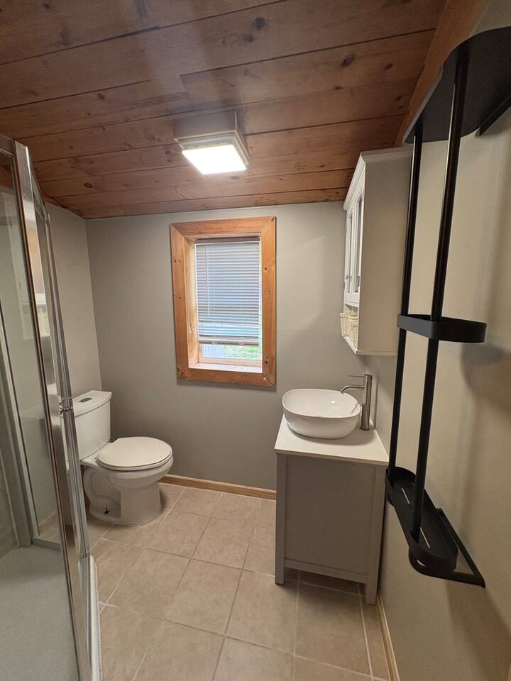 Pine and Paddle is a seasonal cottage located within Back Bay Campground. This 2-bedroom, 1-bathroom cottage comfortably accommodates up to seven guests. Guests enter the house through a small deck into the living space. Here you will find a newly renovated kitchen, dining table seating six, and cozy living room area with a smart TV. The bedrooms are located on the other side. One having a queen mattress, dresser, and mirror. Next door, there is a bedroom with a twin-over-full bunk with a twin trundle. The living room has a full sized pullout couch. The bathroom is newly renovated with a walk-in stand-up shower. Enjoy the private picnic table, grill, and fire pit located outside your cabin. Located within Back Bay Campground, Pine and Paddle offers a private setting with full access to campground amenities, including a heated pool, 24/7 arcade, walking trails, and a camp store offering seasonal rentals and activities. Whether you’re spending the day out on the water, exploring the campground, or unwinding back at the cabin, everything you need for a relaxed lake stay is close at hand. Pine and Paddle is well suited for couples or small families. Pine and Paddle is currently undergoing off-season renovations and will be ready for the upcoming season. Planned updates include a renovated kitchen, bathrooms, and new furnishings. Photos may not reflect the latest improvements, but updated photos will be added once renovations are complete. All descriptions represent the updated features.