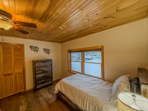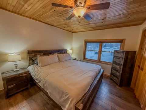 The Lakeside Loft is a newly renovated 2-bedroom, 1-bath guest house with stunning views of Black Lake. Perfect for up to 6 guests. It has a sleek kitchen, cozy bedrooms, and a spacious living area. Relax on the dock, or rent pontoons, kayaks, paddle boats, and lawn games from the camp store. With a pool, arcade, and trails, this lakeside retreat has everything you need for a relaxing getaway! Can be booked with an adjoining 3 bedroom, 2 bath high-end home (listed separately) for larger groups.